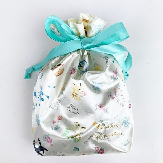同じシリーズのきんちゃくは先ほどまでご紹介したアイテムとは違い、サテン生地で作られています。紐部分もリボンなのでゴージャスでラブリーです♪