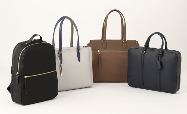 リュックは、「スーツでも使えるお仕事リュック」を用意します。女性でも背負いやすいスリムなデザインですが、荷室はA4サイズの書類が入る大きさで、ノートPCの収納スペースも設けました。メイン素材には合成皮革や光沢のあるポリエステルを使用しており、落ち着いたデザインでスーツなどのビジネスウェアにもマッチします。この他、女性の視点から男性に持ってほしいメンズブリーフバッグも企画し1型用意しています。