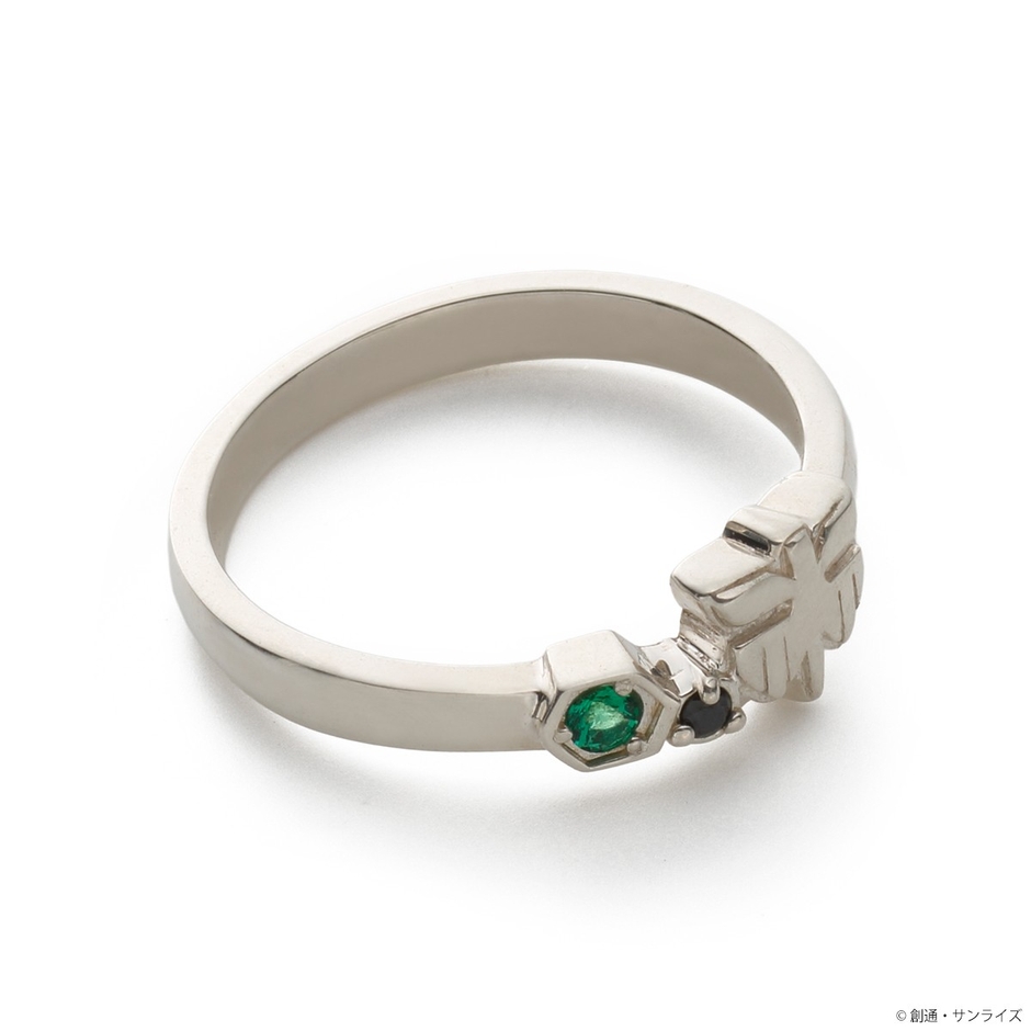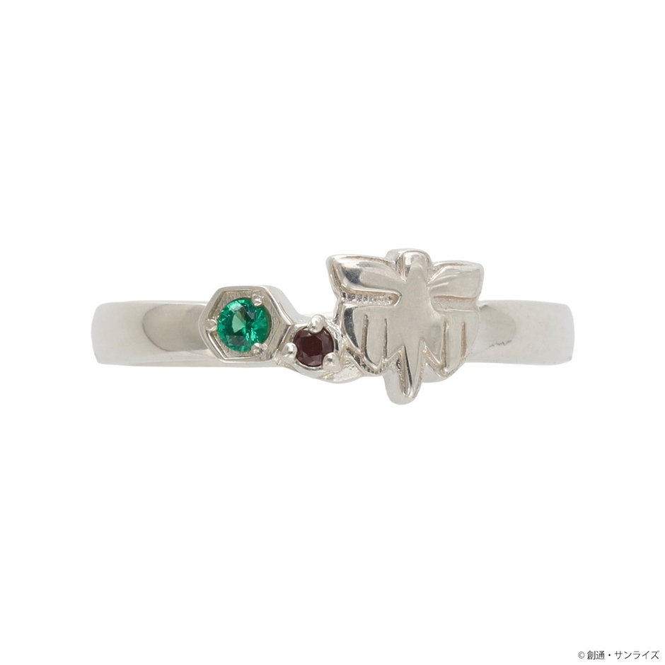 『機動戦士Gundam GQuuuuuuX』のシャリア・ブルをイメージしたシルバーリングです。中佐の胸章をモチーフに取り込んだゆるやかなV字ラインのデザインにイメージカラーストーンを2石セットしました。