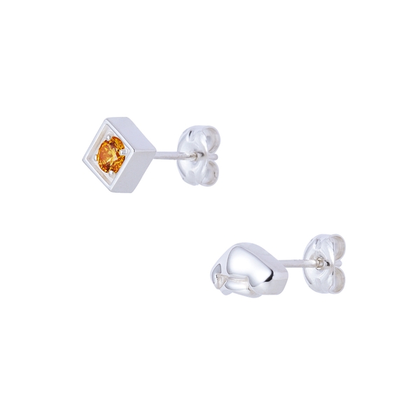 片方は帽子のモチーフ、もう一方はスクエア型の台座にイメージカラーストーンをセットしたアシンメトリーなデザイン。