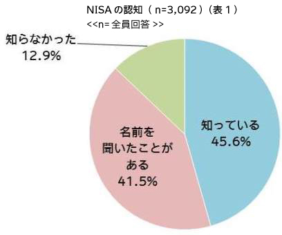NISAについて聞いたところ(表1参照)、「知っている」と回答した方が45.6%、「名前を聞いたことがある」と回答した方が41.5%と、合計して87.1%となりました。NISAが開始され1年半という期間ですが、NISAは既に多くの方に認知されているようです。