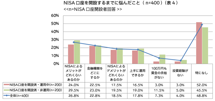 NISA口座を開設している方に、開設するまでに悩んだことを聞いたところ(表4参照)、「NISAによるメリットが不明瞭」と悩んだ方が最も多い結果となっています。NISA口座の運用状況で比較すると、運用していない方は全体的にポイントが高くなっており、開設の際に悩む方が多い傾向がわかります。特に、「100万円も資金の余裕がない」では運用状況でポイントの差が大きくなっていますが、実際は100万円は上限であり必要金額ではありませんので、制度を正しく理解できていなかった状況が伺えます。