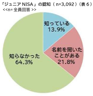 次いで、2016年からスタートするジュニアNISAについて聞きました(表6参照)。今までNISAでは未成年者名義の口座で取引ができませんでしたが、ジュニアNISAがスタートすることにより可能になります。まずは、ジュニアNISAの認知について聞いたところ、「知っている」と回答した方は13.9%、「名前を聞いたことがある」と回答した方が21.8%と合計35.7%となりました。