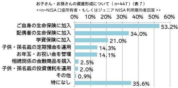一方で、NISA口座所有もしくはジュニアNISA利用意向のある方に、お子さん・お孫さんの資産形成について聞いたところ(表7参照)、約65%の方が具体的に対応を実施していることが分かります。