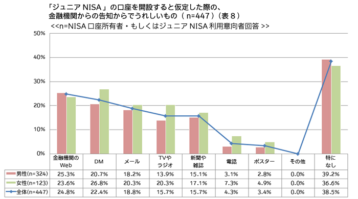 情報を入手するとしたら、金融機関からどのような告知があるとうれしいと思うかを聞いたところ(表8参照)、最も多い回答は「金融機関のWeb」の24.8%でした。次いで「DM」という回答が多く、特に女性ではDMが最も多くなっています。