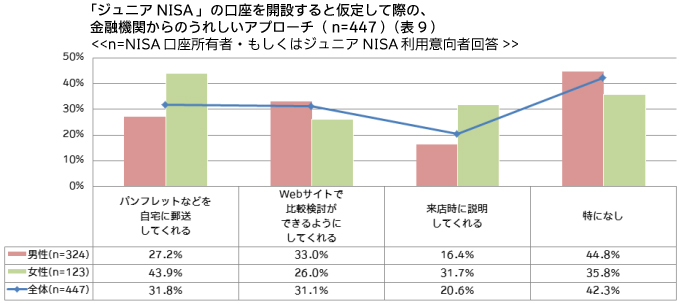 また、金融機関からのアプローチでも(表9参照)、「パンフレットなどを自宅に郵送してくれる」が最も多くなっています。NISA口座開設時の不安点・疑問点(表4・5参照)では、特に口座を運用していない方が「制度が分かりにくい」と回答しました。理解不足が生じていることから、ジュニアNISAを告知する際には、WEBやDM、パンフレットなどのツールにおいて、理解しやすくするためのフォローが重要であると考えられます。