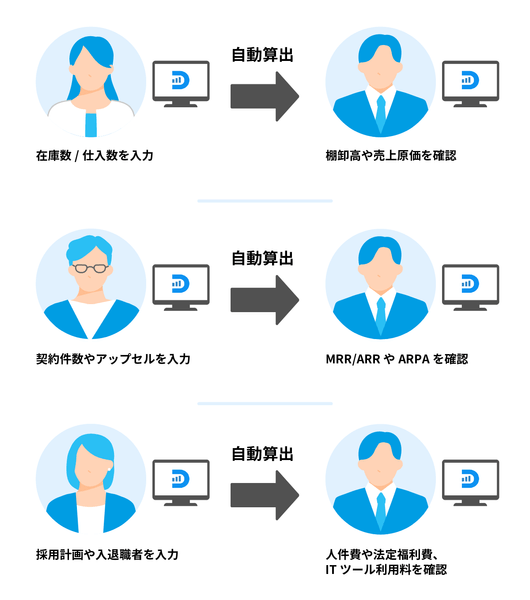 今回のメジャーアップデートにより、現場が管理するKPI(人員数/契約数など)の変更を行うだけで、損益計算書(PL)への自動反映と、貸借対照表(BS)の管理指標の更新を可能にします。