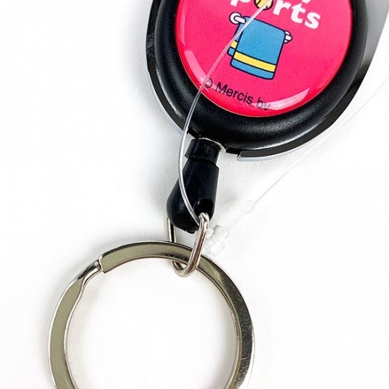 リングの部分に鍵やをつけておいて、上のカラビナをバッグやポーチなどに取り付けて持ち運べちゃえるんです。しかも、リールなのでバッグにつけたままで伸ばせば、そのまま鍵を使うこともできます。
