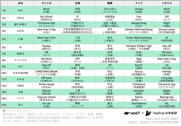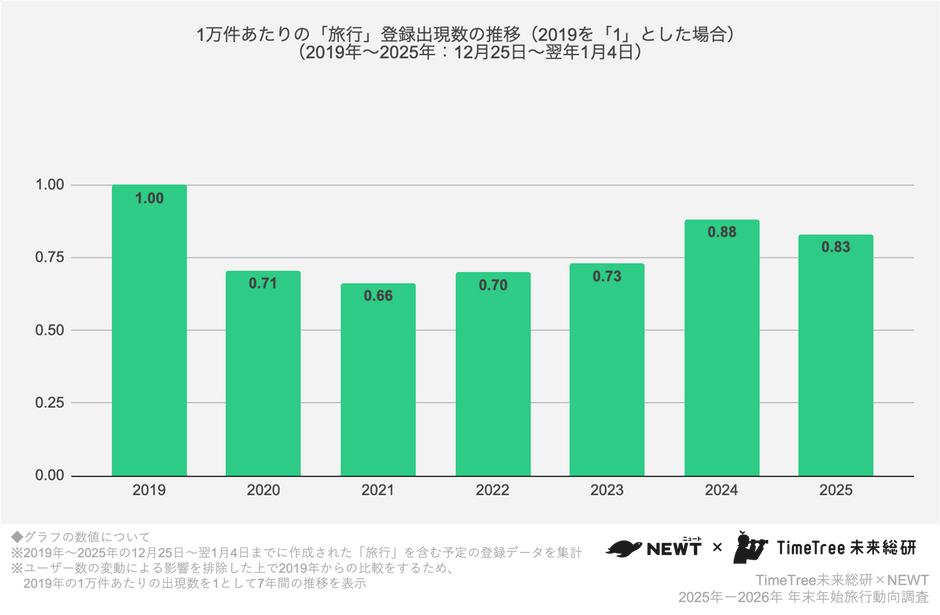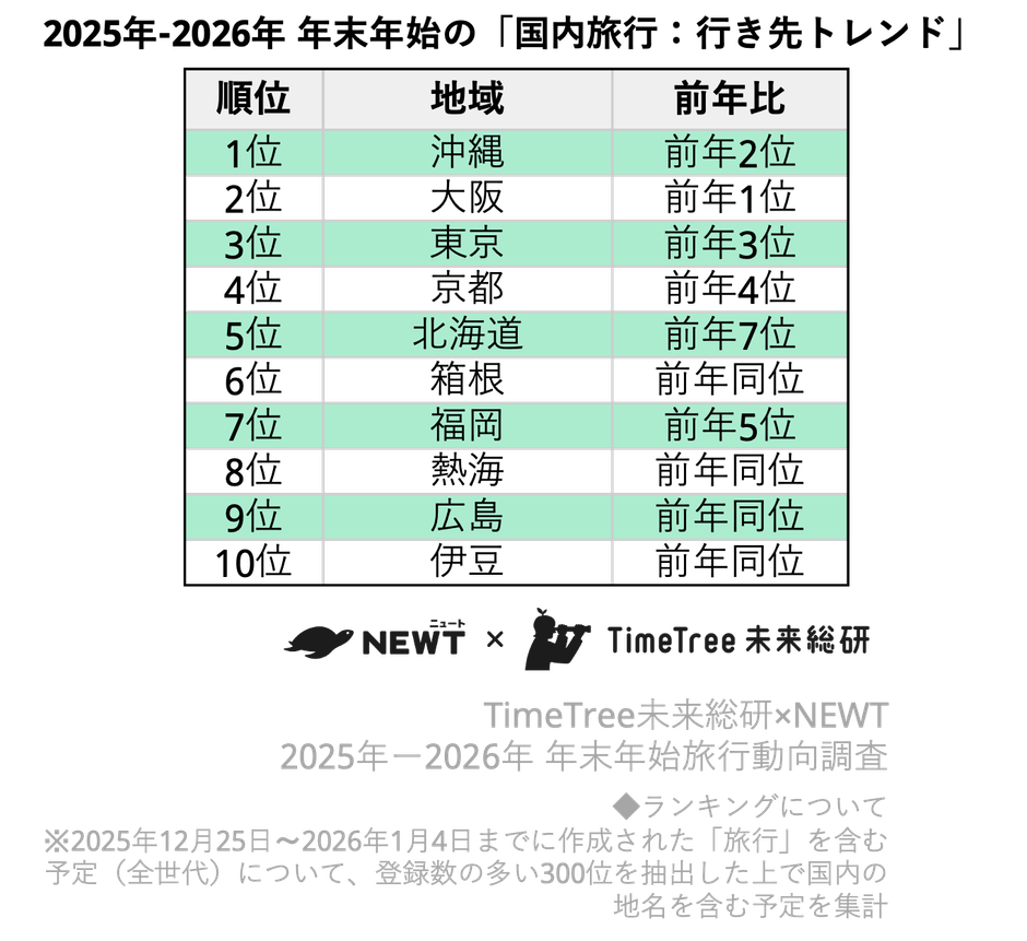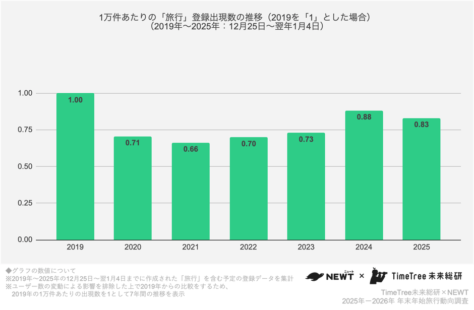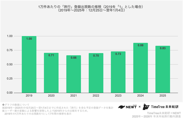 株式会社TimeTree(本社:東京都新宿区、代表取締役社長:深川 泰斗)の社内研究所『TimeTree未来総合研究所』(https://timetreeapp.com/intl/ja/future-research-institute)と株式会社令和トラベル(本社:東京都渋谷区、代表取締役:篠塚 孝哉)が運営する、かしこい、おトク、旅行アプリ『NEWT(ニュート)』は、共同で2025年〜2026年・年末年始の旅行動向を分析しました。TimeTree未来総研は、年末年始(2025年12月25日〜2026年1月4日)に登録された「旅行」を含む予定データを分析し、旅行アプリ『NEWT』は同アプリにおける予約データを解析しました。