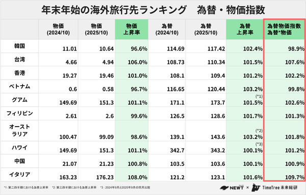 ◼︎為替×物価で見る海外 年末年始、コスパがいいのは韓国とベトナム!香港・イタリアは割高だが工夫次第でおトクに