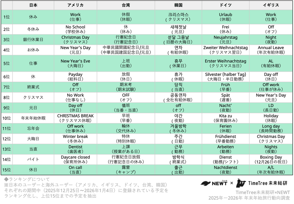 一方、アメリカとイギリスでは「Work(仕事)」が1位となり、年末年始も通常営業を継続する社会が反映されています。興味深いことに、イギリスでは「Boxing Day(12月26日の祝日)」、ドイツでは「Zweiter Weihnachtstag(クリスマス翌日)」が上位に入っており、両国ではクリスマスの翌日も祝日として定着している文化の違いも見られます。
