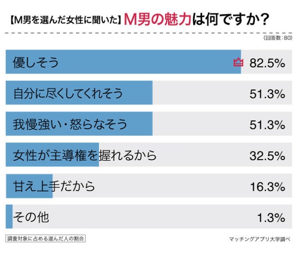 一方で「Mの男性」を選んだ理由をみてみると、「優しそう」(82.5%)がダントツで多く、続いて「自分に尽くしてくれそう」(51.3%)と「我慢強いから・怒らなそうだから」(51.3%)が同率、「女性が主導権を握れるから」(32.5%)、「甘え上手だから」(16.3%)となりました。