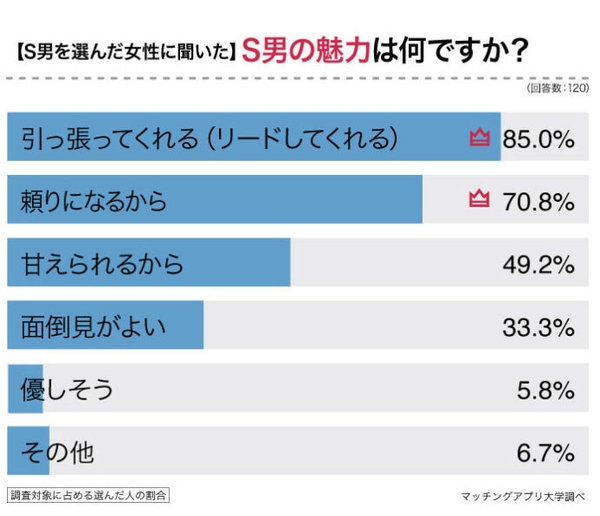 「Sの男性」と回答した女性に理由を選んでもらったところ、「引っ張ってくれる(リードしてくれる)」(85.0%)がもっとも多く、次いで「頼りになるから」(70.8%)と続き、「甘えられるから」(49.2%)、「面倒見が良い」(33.3%)という結果となりました。