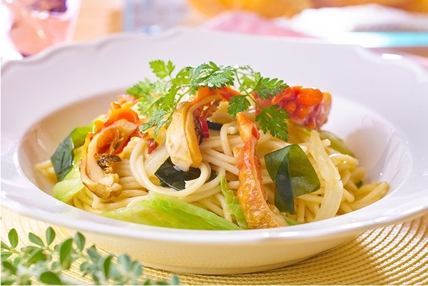 加熱することで独特のクセが和らぎ甘みが増すホヤと、春ならではの食材菜の花を使ったペペロンチーノ風のパスタ。オイルと塩のシンプルな味付けで食材の美味しさをダイレクトにお楽しみください。