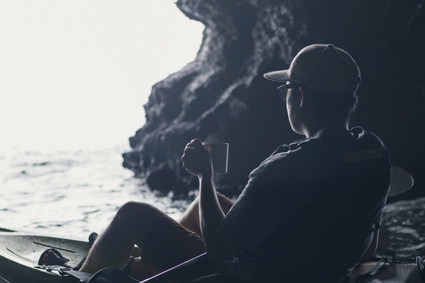 陸からはアクセスできない海岸線には、浸食で形成された海食洞があります。カヤック1艇がようやく潜り込めるような洞穴は、海面で反射した光が創る神秘的な世界です。神秘的な世界を独り占めする洞穴での休息には、星のや沖縄のスタッフが香り高いコーヒーを用意します。静けさに包まれながら、のんびりとコーヒーを味わう。心も身体もリラックスする特別な時間を過ごします。