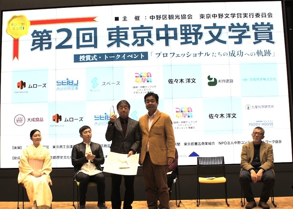 中野から世界に向けて新たな物語を発信することを目的につくられた「第2回 東京中野文学賞」(主催:一般社団法人中野区観光協会・東京中野文学賞実行委員会)の授賞式が3月29日(土)、中野区役所内のイベントスペース、ナカノバで開催。約200人の観客が集まる中、大賞、佳作、中野区賞と今回新設されたクラファン賞の発表、授与が行われました。