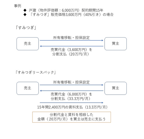 この度あらたにサービス展開された「すみつぎリースバック」においては、購入者が高齢者の自宅を購入すると同時に、売主である高齢者に対して当該住宅を賃貸として貸し出すこととなります。買主が物件取得の対価として毎月売主に対して支払う売買の分割代金と、売主である高齢者が毎月賃貸人としての買主に支払う賃料が相殺されるため、実際には買主が売主である高齢者に対して毎月一定の金額を支払うこととなります。従って、売主から見た場合には「すみつぎリースバック」においても、高齢者が毎月の収入を得て老後の生活資金に利用できる点は従前の「すみつぎ」と変わりはありません。