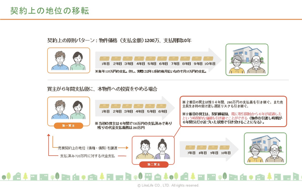 例えば、当初、高齢者の方ととの間で10年間の「すみつぎ」や「すみつぎリースバック」に取り組んだ場合に、最初の購入者の方が6年間分割代金を支払ったのちに物件を売却した場合、次の購入者の方が残りの4年間の分割代金の支払い義務を承継することとなります。最初の購入者が10年後に物件の引き渡しが行われる予定であったのに対し、2番目の購入者は4年後に物件の引き渡しが予定されることとなり、より近い将来の物件引渡しを得られるというメリットがあります。