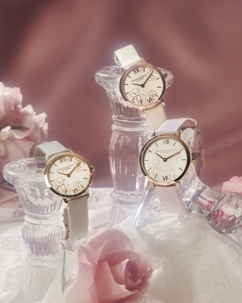 柔らかなアイボリーカラーの文字盤には、繊細なゴールドラインで描かれた抽象的な花々をあしらい、可憐でありながらも凛とした印象に。上質なメタリックの輝きが春の光を受けて、まるで花びらが風に揺れるように、手元に優雅なニュアンスを添えます。カラーは、それぞれ異なる表情を楽しめる3色展開。