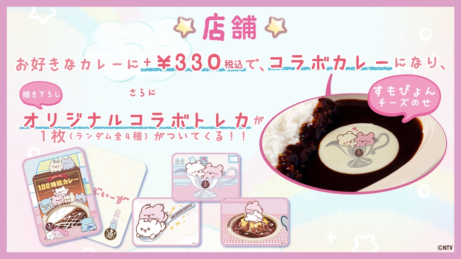 お好きなカレーに+¥330(税込)で、コラボカレーになり(すもぴょんチーズのせ)、さらに描き下ろしオリジナルトレーディングカードが1枚(全4種ランダム)がついてくる!!