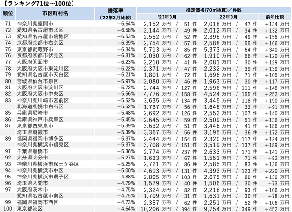 • 100位以内の市区で、前年(2022年3月)価格以上となったのは81市区。なお、3ヶ月前(2022年12月)の価格以上となったのは47市区、前月の価格以上となったのは50市区。