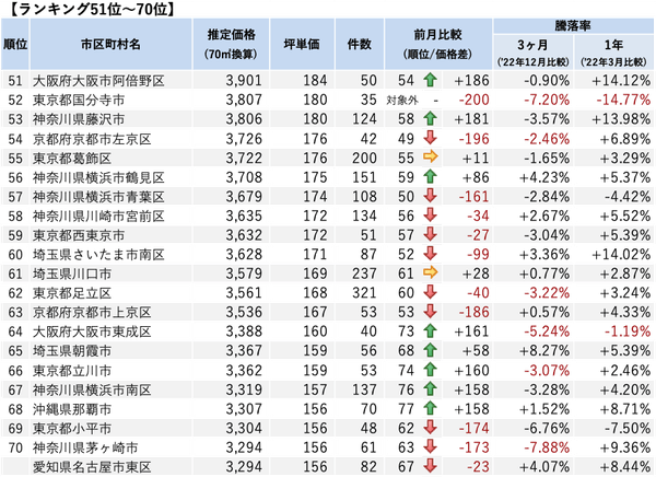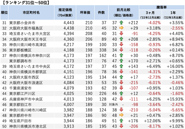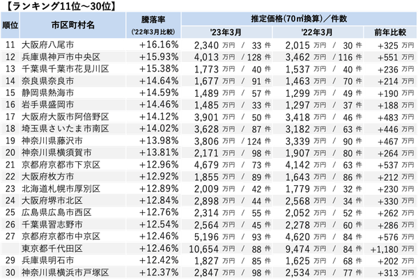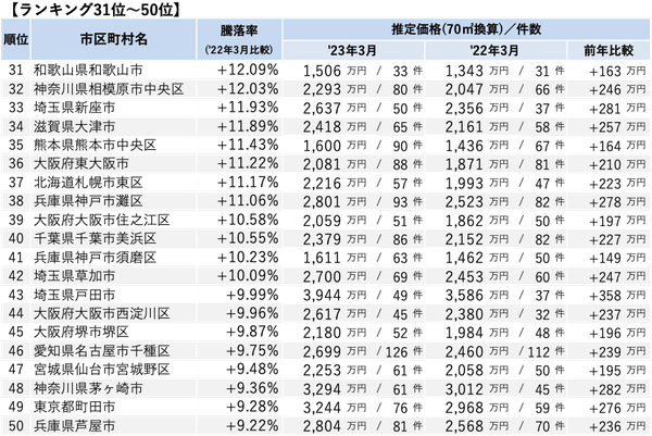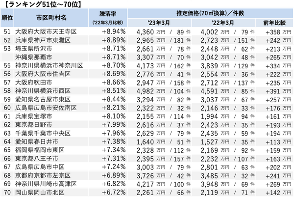 ※推定価格ランキングは2023年3月の販売件数が30件以上ある238全国市区町村、騰落率ランキングは2023年3月と2022年3月の販売件数がそれぞれ30件以上ある203全国市区町村が対象。