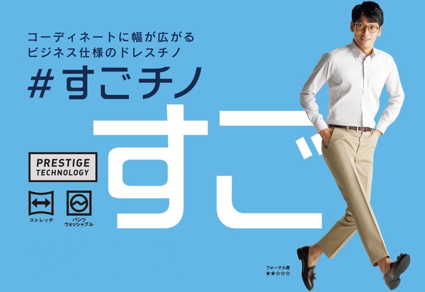青山商事株式会社(本社:広島県福山市/代表取締役社長:青山理(おさむ))は、夏アイテムの高い機能性を訴求する商品カテゴリー「すごシリーズ」の第3弾として、機能的なコットンパンツ(チノパン)を「洋服の青山」から発売。これらのチノパン商品を“すごチノ”として打ち出していきます。