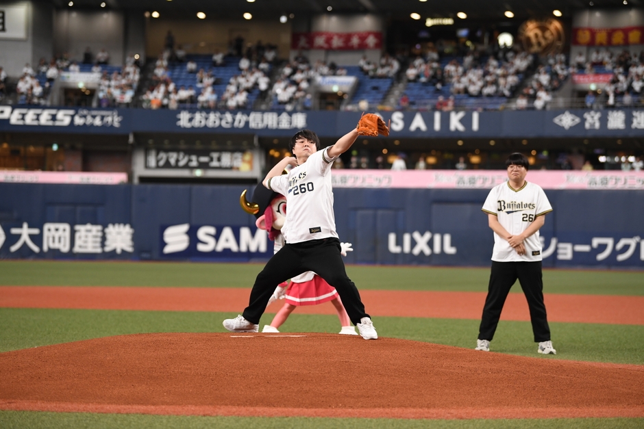 気合が入った様子の2人は、「TADOKORO」「SEKIMACHI」という名前と、背番号にBS松竹東急のチャンネル番号「260」の入ったバファローズのユニフォームを身にまといグラウンドへ向かいました。2人の登場でドームは大きな拍手と歓声に包まれる中、笑顔で手を振り応えながらマウンドへ立った田所、その隣で「運動神経がものすごく悪くて、運動とは無縁の男ですが、今日はしっかりとストレートでストライクを入れられるよう練習してきましたので、皆さん応援してくれぇい!」と持ちネタを交えながら大きな声援を送る関町とのやり取りに、大きな笑いが巻き起こりました。そして、“運動神経悪い芸人”でおなじみでもある田所が大きく振りかぶると、豪快なフォームで見事なピッチングを披露しました。球を真っ直ぐに投げ込むと、右手を大きく挙げてガッツポーズ、そして関町も隣で大きな拍手を送り始球式を終えました。