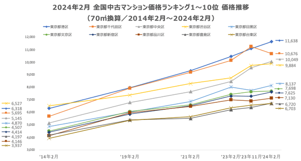 調査。坪単価をベースに70㎡での価格に換算した「中古マンション価格」*1と価格ランキング上位20件について過去10年間の価格推移、および1年前からの価格の上昇率を表す「騰落率」のランキングを発表いたします。