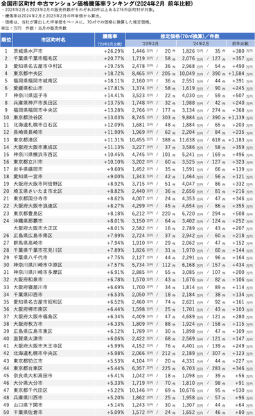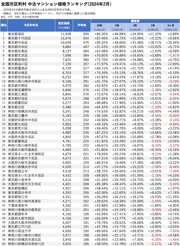 「マンションレビュー」2024年2月 全国市区町村 中古マンション価格/騰落率ランキングを発表