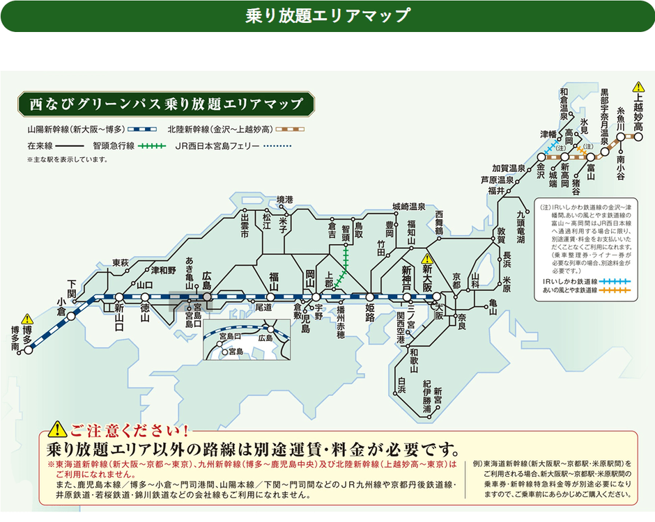 JR西日本全線と智頭急行線の新幹線・特急列車・普通列車(新快速・快速含む)の普通車自由席、宮島フェリーに乗り放題