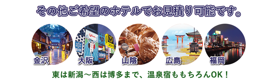 日本全国の航空券手配・JR西日本利用「西なびグリーンパス」「北陸エリアどこでもきっぷ宿泊プラン」「中国エリアどこでもきっぷ宿泊プラン」・JR九州利用「みんなの九州きっぷ宿泊プラン」なども販売しております。
