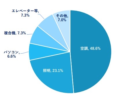 これらを合わせると7割以上を占めるため、空調や照明での節電対策は特に有効です。