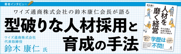 株式会社幻冬舎ゴールドオンライン(本社:東京都渋谷区千駄ケ谷4丁目9番7号、代表取締役:山下征孝)は、同社が運営する「話題の本.com」(https://wadainohon.com)にて2023年7月24日(月)、著書『人材を磨く経営 中小企業は社員の個性を活かして伸ばす』を刊行した、ワイズ通商株式会社の鈴木康仁会長のインタビュー記事を公開しました。