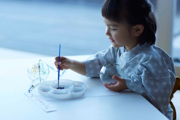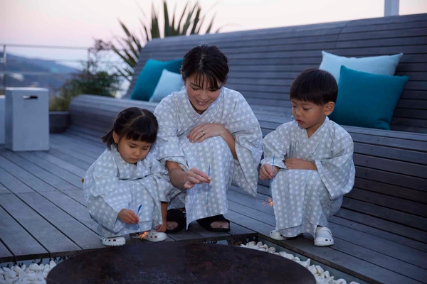 広々としたテラスリビング付きの客室「テラスリビングスイート(158平米)」、「テラスリビングコーナー(137.5平米)」は、最大で4歳以上6名と3歳以下6名の計12名が同時に宿泊することができます。ゆったりとしたリビングスペースと2つのベッドルームがあり、大人数でも快適です。夜はテラスに出て、客室に用意された線香花火を楽しむことができます。線香花火をみんなで囲むことで、会話がより一層弾みます。また、音からも夏を感じられるよう、涼しげな見た目と音色が特徴の「みしま風鈴(*)」を用意。本プランでは、絵の具を使ってオリジナルデザインの風鈴をつくることができます。客室で滞在中に音を楽しむことはもちろん、家に持ち帰ることも可能です。