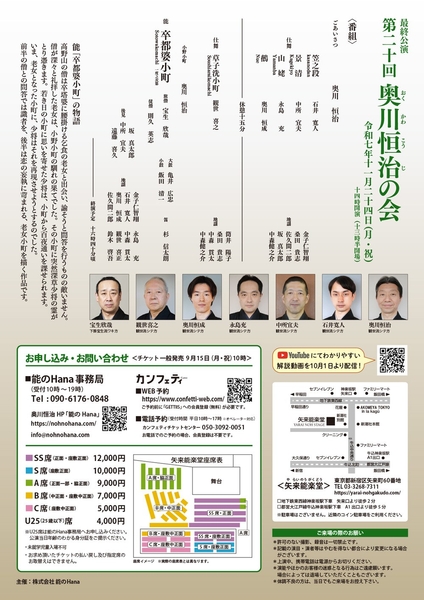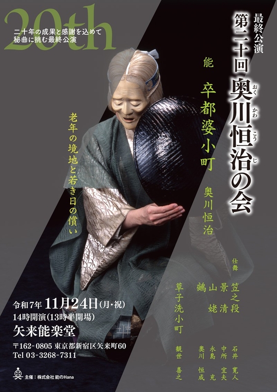 第20回奥川恒治の会「卒都婆小町」が2025年11月24日 (月・祝)に矢来能楽堂(東京都 新宿区 矢来町 60)にて上演されます。