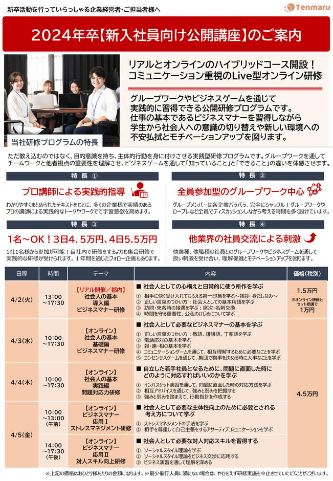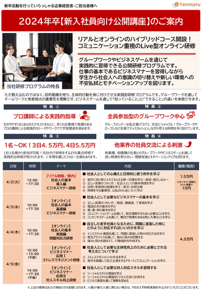 組織づくりや人材教育・キャリア開発、人材採用支援を行う株式会社Tenmaru(本社:東京都港区、代表取締役:諸戸 歩)は、2024年卒の新入社員向け公開型研修を実施します。コミュニケーション方法が多様化した世代の新卒人材が不安に感じている内容を盛り込み、社内外ともに活躍でき信頼される社会人の第一歩を踏み出す学びを提供します。