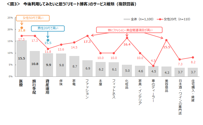 性年代別で見ると「医療」は女性50代、「資産運用」は男性の20代が最も高い。また、女性20代は平均的にどの項目も高く、その中でもファッション・美容関連商品の項目が特に高い傾向。20代女性は画面越しのコミュニケーションに抵抗感が低い様子がうかがえる。<図3>