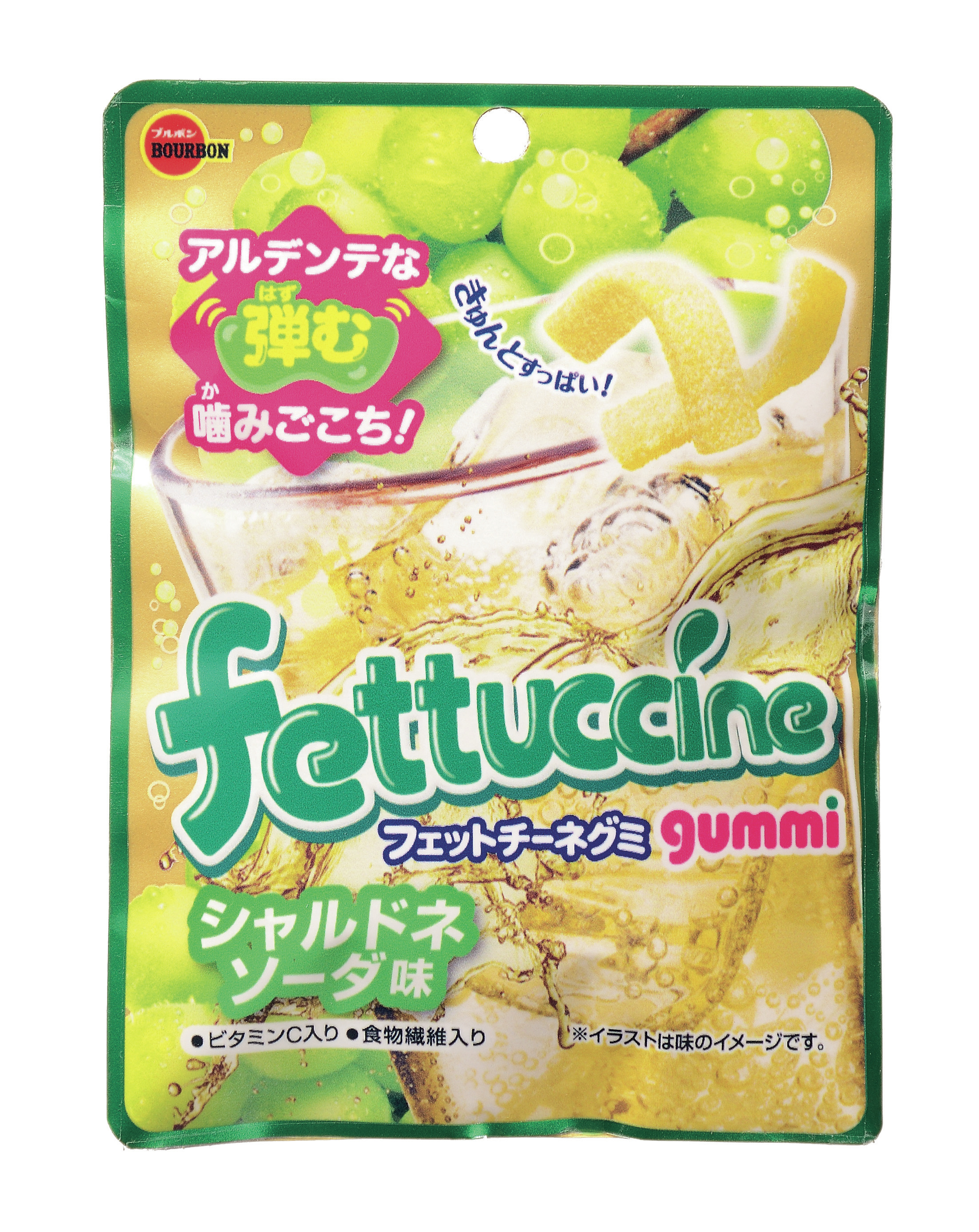 「フェットチーネグミ シャルドネソーダ味」は、ぶどうの一品種であるシャルドネ特有のフルーティな味わいを爽やかなソーダ調に仕上げました。