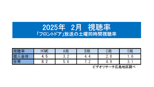 広島ホームテレビ(本社:広島市中区)で毎週土曜ごご1時から放送、ひろしま深掘りライブ「フロントドア」は、2025年の2月月間視聴率で個人全体・世帯いずれも同時間帯1位(ビデオリサーチ調べ、広島地区)を記録しました。