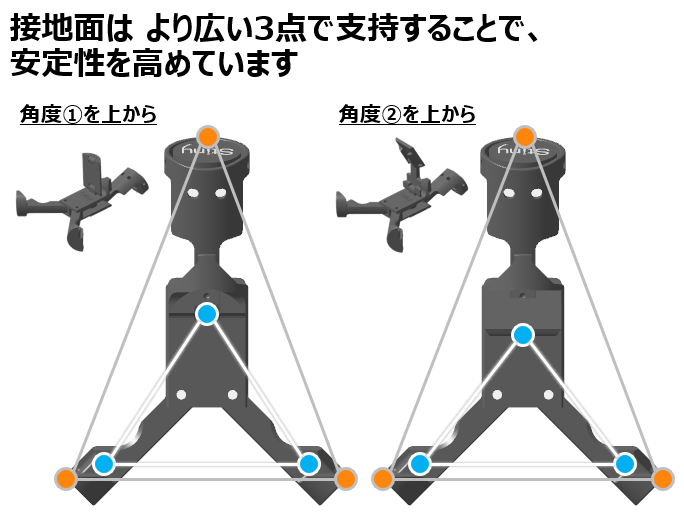 - ダブル三点支持による安定構造:接地面とスマホ支持部にそれぞれ3点支持構造を採用。不安定な場所でも抜群の安定性を実現し、あらゆるスマートフォンに対応します。(非常に厚いケースには一部非対応)