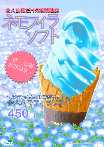 ネモフィラの青をイメージした「ネモフィラソフト」を期間限定で販売します。ラムネチップ入りのさわやかな風味のソフトクリームで、舎人公園でしか味わえない特別商品です。ぜひご賞味ください。