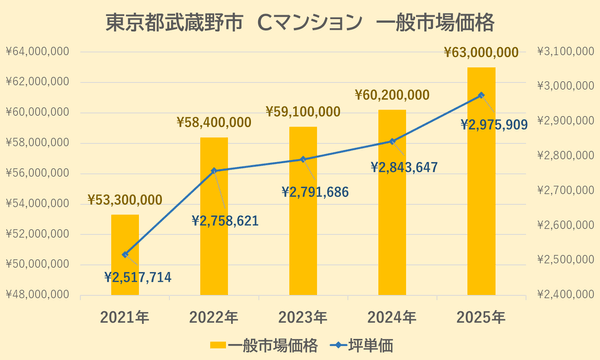 Cマンションの一般市場価格・坪単価の推移は上記【図5】の通りです。
