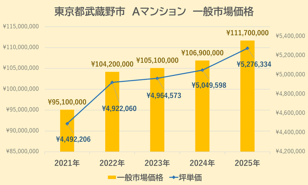 Aマンションの一般市場価格・坪単価の推移は上記【図3】の通りです。