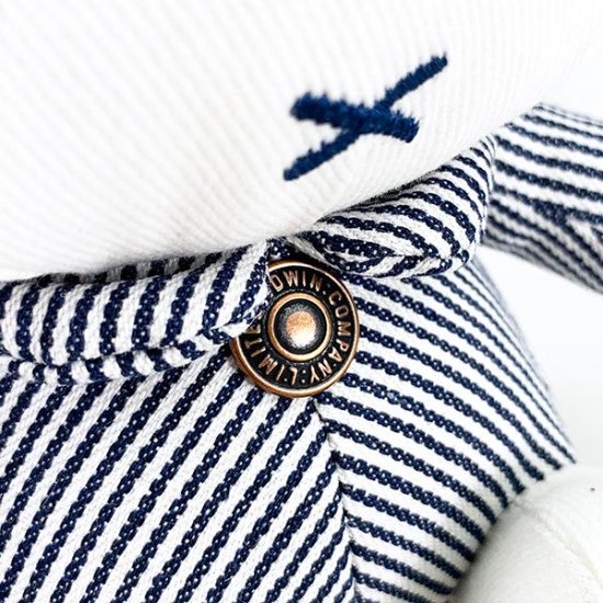 ヒッコリー柄のお洋服を着た、クラシックな雰囲気のミッフィーのぬいぐるみ。足の裏には、デニムの後ろポケットなどにデザインされているステッチが入っています。