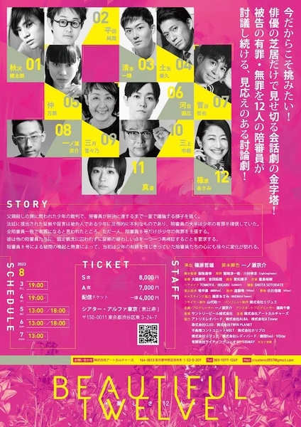 株式会社アートカルチャーズ主催、『Beautiful Twelve ~ 美しき12人 ~』がにシアター・アルファ東京(東京都渋谷区東3-24-7B1F)にて上演されます。 チケットはカンフェティ(運営:ロングランプランニング株式会社、東京都新宿区、代表取締役:榑松 大剛)にて発売中です。