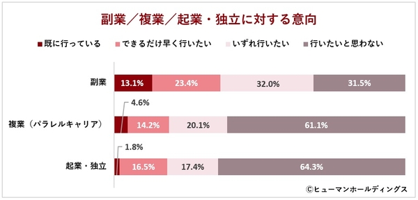 「副業」「複業(パラレルキャリア)」「起業・独立」について、それぞれに対する意向を聞くと、「副業」に関しては「既に行っている(13.1%)」「出来るだけ早く行いたい(23.4%)」「いずれ行いたい(32.0%)」で、68.5%が好意的に考えていることが伺えます。一方、「複業(パラレルキャリア/本業を複数行う)」と「起業・独立」に対してはそれぞれ61.1%と64.3%が「行いたいと思わない」と回答しています。