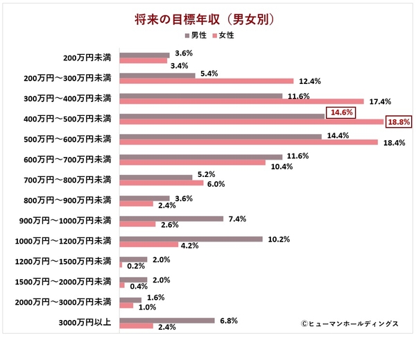 ●「将来の目標年収」 は、男女ともに「400万円~500万円」が最多。「令和4年分 民間給与実態統計調査」(国税庁)による「平均年収458万円」前後を目標としている