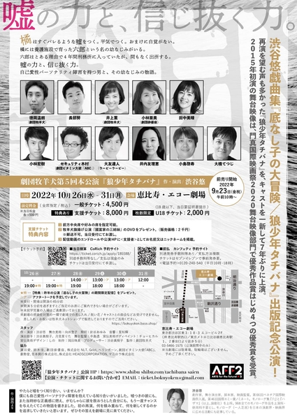 劇団牧羊犬(主宰:渋谷悠)第5回本公演『狼少年タチバナ』が2022年10月26日 (水) ~2022年10月31日 (月)に恵比寿・エコー劇場(東京都渋谷区東3-18-3エコ-ビル)にて上演されます。チケットはカンフェティ(運営:ロングランプランニング株式会社、東京都新宿区、代表取締役:榑松 大剛)にて発売中です。