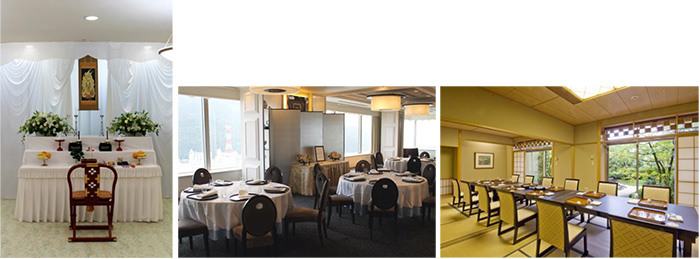(左から)祭壇イメージ、眺めの良い18F宴会場「ベルビュー」、日本料理「藍彩」個室これは昨今、ホテルでの法要がご参列者へのサービス面、スペースや準備の点で利便性が高く、需要が増加していることをうけてのものです。
